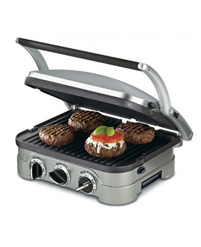 Le gril Griddler de Cuisinart est des plus multifonctionnel! Avec cinq options de cuisson, il permet de préparer des crêpes et saucisses, des sandwiches au fromage fondu, des steaks, des hamburgers et des paninis. Le couvercle flottant et des plaques réversibles et amovibles transforment le Griddler en un gril de contact, un gril-presse à paninis, un gril complet, une plaque à frire ou moitié gril/moitié plaque à frire. Deux contrôles de la température assurent une cuisson parfaite!